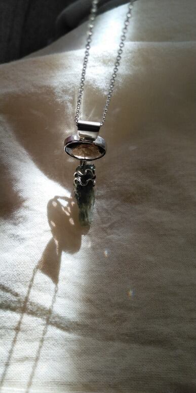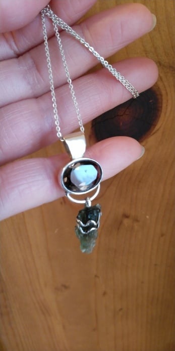 モルダバイト原石・スモーキークォーツ(オーバルラウンドカット)ペンダントペンデュラム(スターリングシルバー925製)& スターリングシルバー925製ネックレスチェーン(約44~45㎝)ポーチ付属