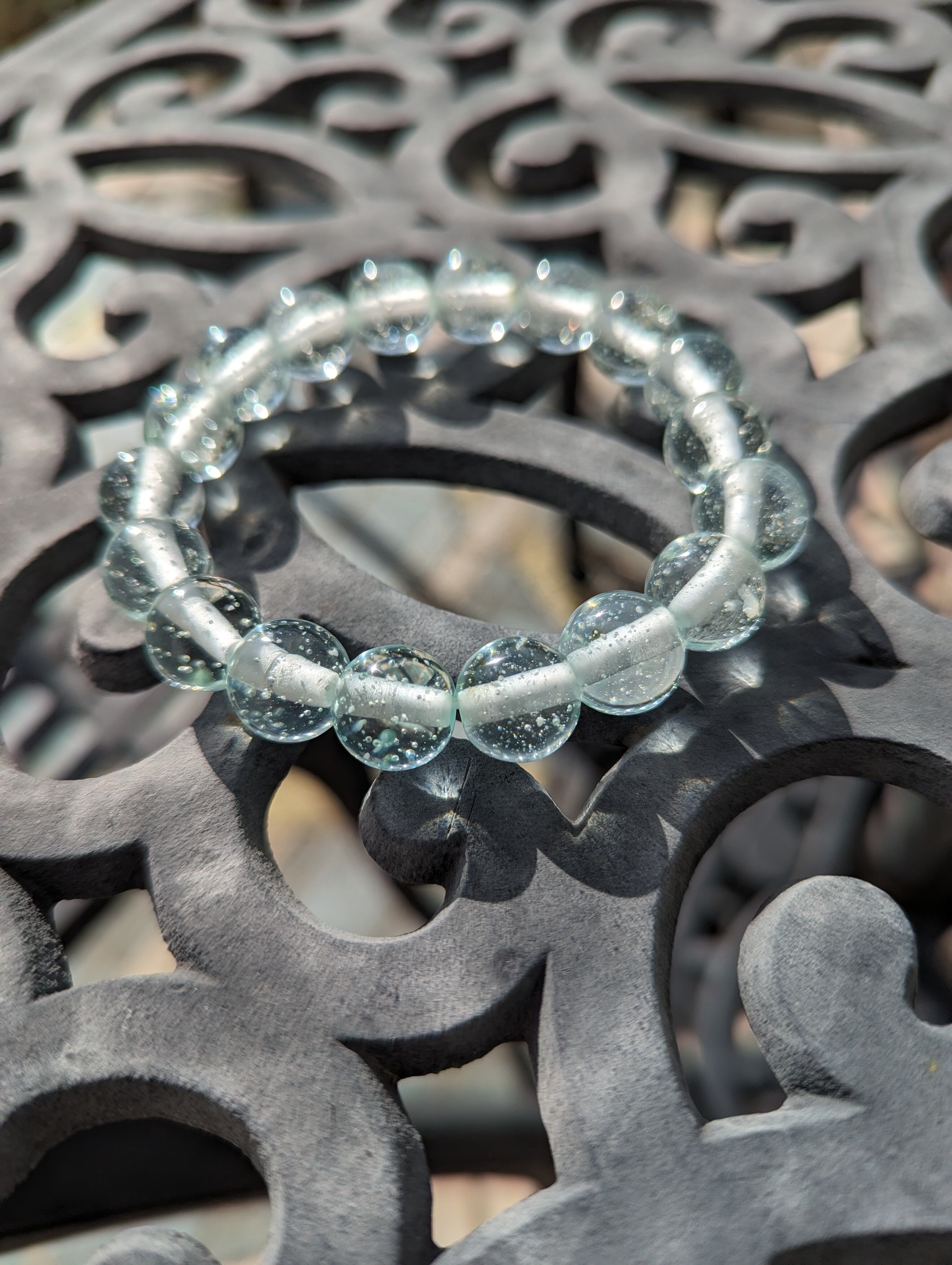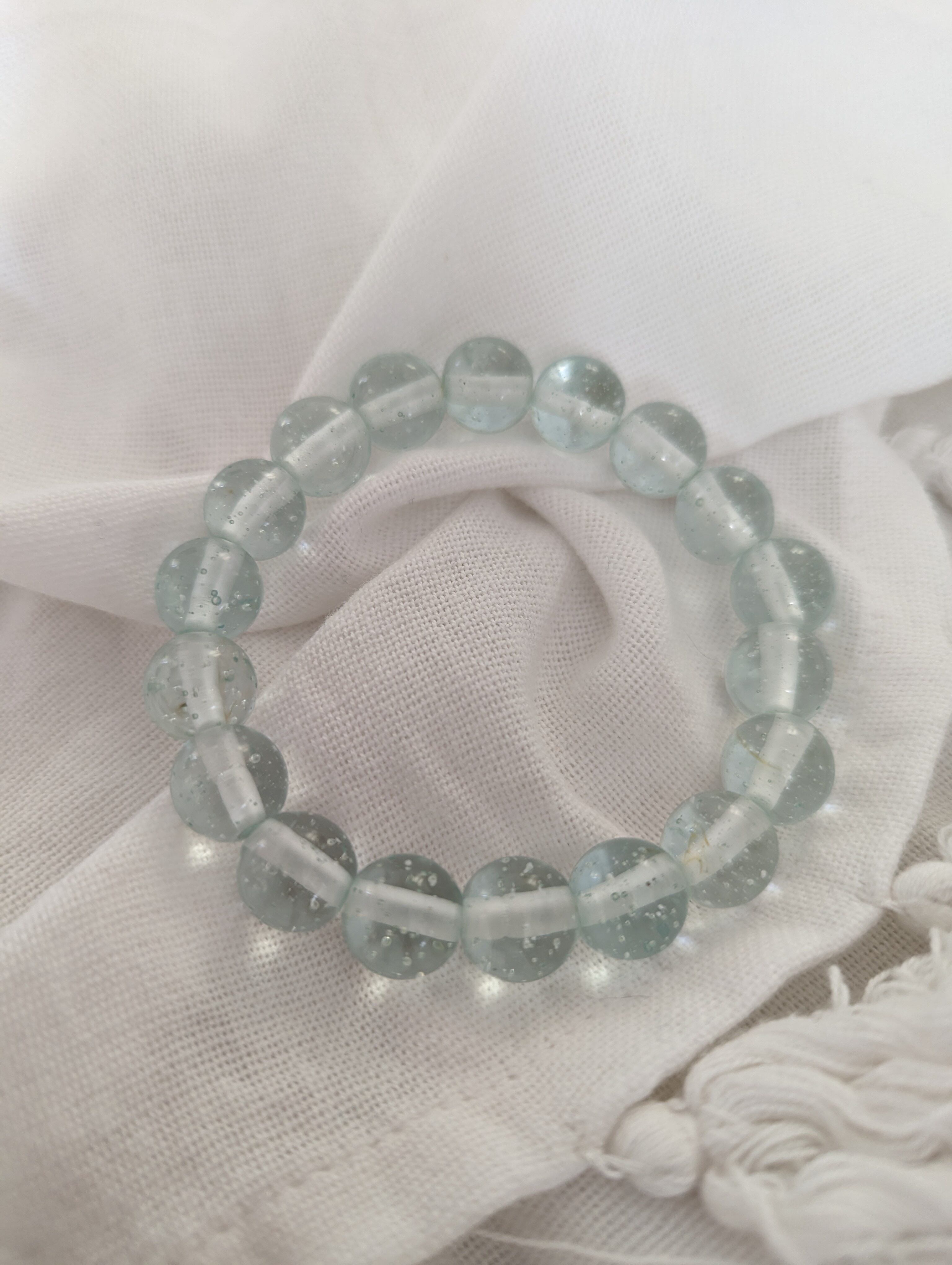 インドネシア産アンダラクリスタルのカラーバリエーションは多様にございますが、こちらはシーフォーム(気泡)が無数にみられるレアな淡い水色となります。人それぞれ感じ方は異なるでしょうが、このシーフォーム(気泡)を見て触れていると心身共に癒されてしまうのです。【癒し】というワードがピッタリなブレスレットではないでしょうか。