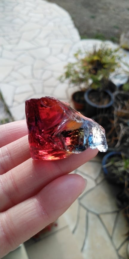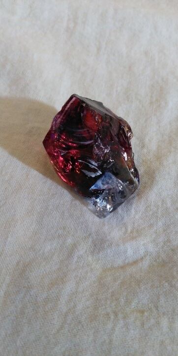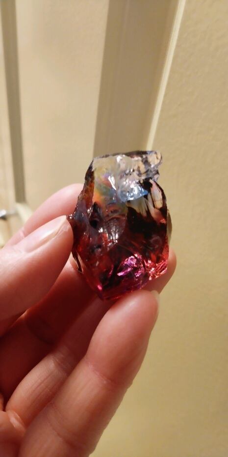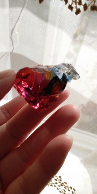 こちらは人気色のマルチカラーとなります。一見するとラズベリーレッドが大きく占める様にも見えるのですが、触れて見るとブルーやイエロー、オレンジそして印象的なクリアカラーが見られるのです。人それぞれ感じ方は異なるでしょうが、艶々というよりは荒々しい表面をしておりアーティスティックな印象を受けるのです。全体的に深く刻まれた様なエッジからはとても強いエネルギーが感じられる、ワンオクターブ上のアンダラクリスタルではないでしょうか。見る角度や置き方、光の質や角度により様々な表情を見せてくれるこのアンダラクリスタルは、持つ方の変容をサポートしてくれるのではないでしょうか。