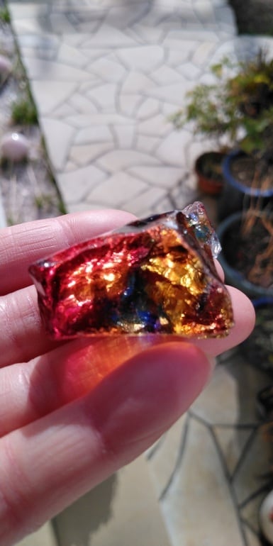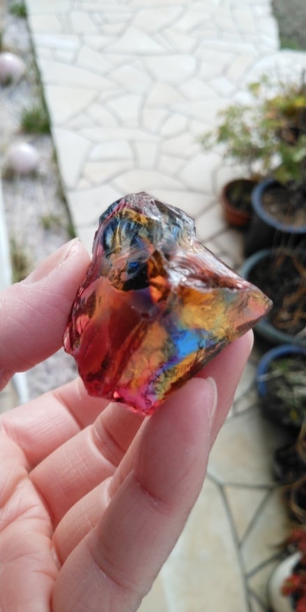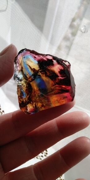 こちらは人気色のマルチカラーとなります。パッと見てブルーやイエロー、オレンジ、ラズベリーレッド、クリアカラーが混じり合っているのがわかる、マジカルで大変美しいアンダラクリスタルとなります。人それぞれ感じ方は異なるでしょうが、珍しく艶やかな部分も見られる荒々しい表面からは力強さとアーティスティックな印象を受けるのです。全体的に深く刻まれた様なエッジからはとても強いエネルギーが感じられる、ワンオクターブ上のアンダラクリスタルではないでしょうか。見る角度や置き方、光の質や角度により様々な表情を見せてくれるこのアンダラクリスタルは、持つ方の変容をサポートしてくれるのではないでしょうか。
