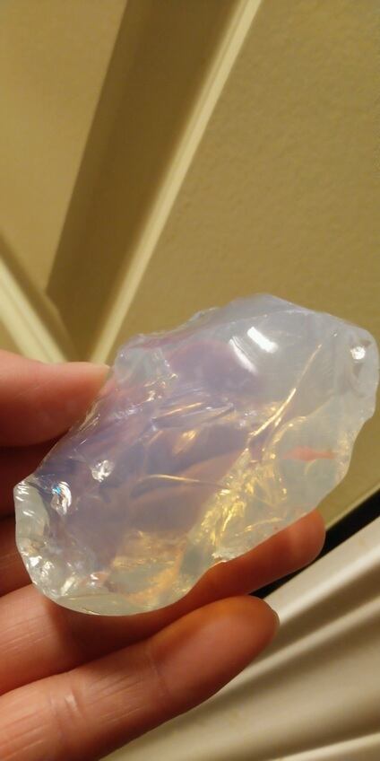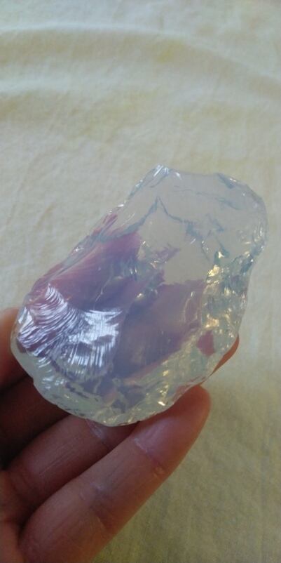 アンダラクリスタルのカラーバリエーションは多く見られますが、こちらは当ショップでも人気の高いホワイトオパールとなります。エンジェルオーラともいわれる神秘的な美しい色合いを魅せてくれるのです。光の質や当たり方により、煌めきとカラーチェンジするかのような美しい色合いは、視覚からも癒されます。人それぞれ感じ方は異なるでしょうが、手にするとクラウンチャクラがオープンとなり、天使のような優しくも心強いエネルギーが全チャクラを活性化、そして癒してくれる様に感じられるのです。美しい虹が複数個所見られます。全体的にはバランスの良いオーバルラウンドとなりますが、鋭利な部分が多少多めに見られましたので部分的に研磨させて頂きました。
