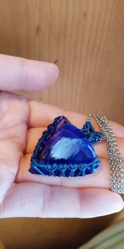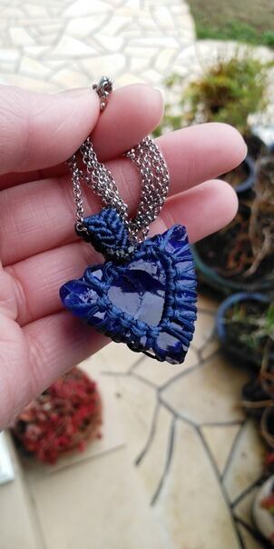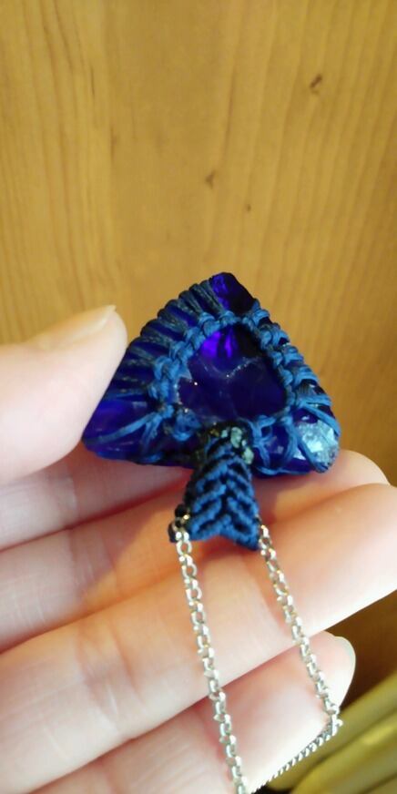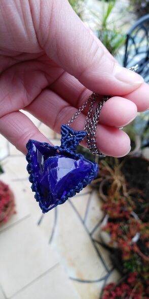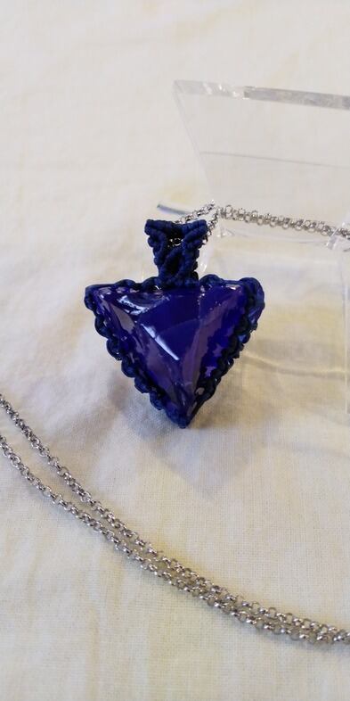シェラネバダ産 アンダラクリスタル ブルーパープル(タンザナイトファイヤー) マクラメ編みデザインペンダントトップ&ステンレスチェーン 約60㎝ ポーチ付属