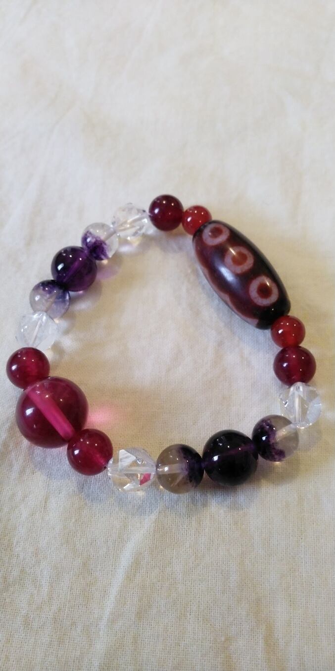 天珠、インドネシア産アンダラクリスタル二種、バイカラーフローライト、アメジスト、多角面カット水晶とカーネリアンを使用しました一点物のデザインブレスレットとなります。
