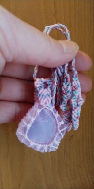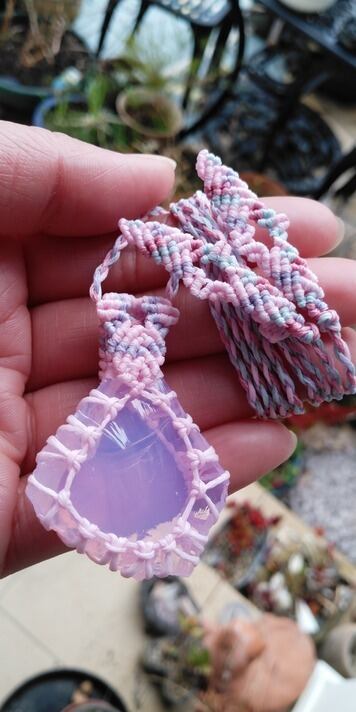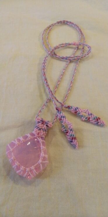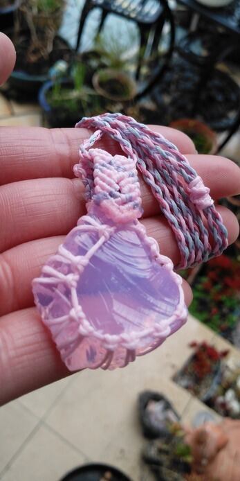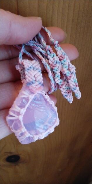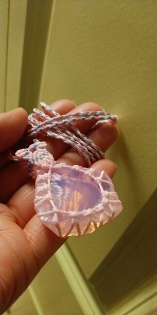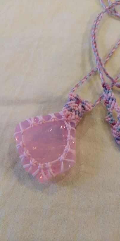 インドネシア産 アンダラクリスタル ミルキーピンク(オパールピンク) マクラメ編みデザインネックレス 紐長さ約88㎝位まで調節可能