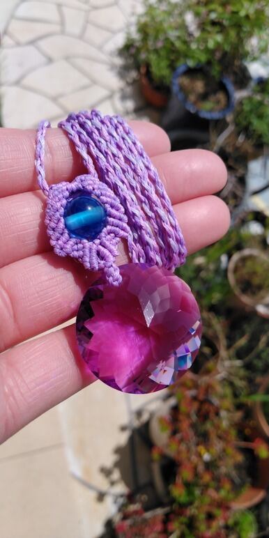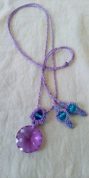 インドネシア産 アンダラクリスタル 多角面ラウンドカット・パープルピンク(カラーチェンジ)& ライトブルービーズ三珠 マクラメ編みデザインネックレス 紐長さ約114㎝位まで調節可能 ポーチ付属
