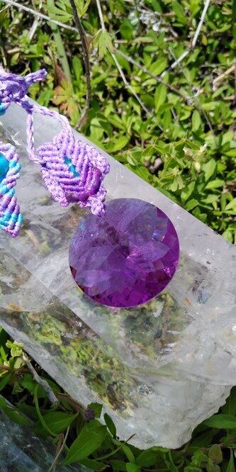種類:インドネシア産アンダラクリスタル 多角面ラウンドカット・パープルピンク 最大幅約30mm、ライトブルービーズ 約9,5~10mm×三珠