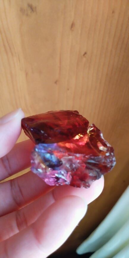 インドネシア産アンダラクリスタルのカラーバリエーションは多様にございますが、こちらは神秘的なマルチカラーとなります。ラズベリーレッドとオレンジをメインにイエローやパープルが入り混じって見えるのです。人それぞれ感じ方は異なるでしょうが、艶々というよりは荒々しい表面をしておりカッコいい印象を受けるのです。全体的に深く刻まれた様なエッジからはとても強いエネルギーが感じられる、ワンオクターブ上のアンダラクリスタルではないでしょうか。持つ方の魂、三位一体、過去生を含めた、調和や統合をサポートしてくれるのではないでしょうか。