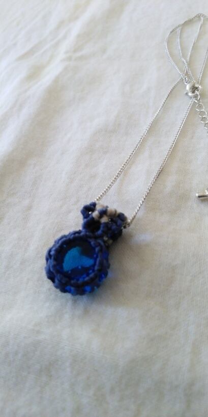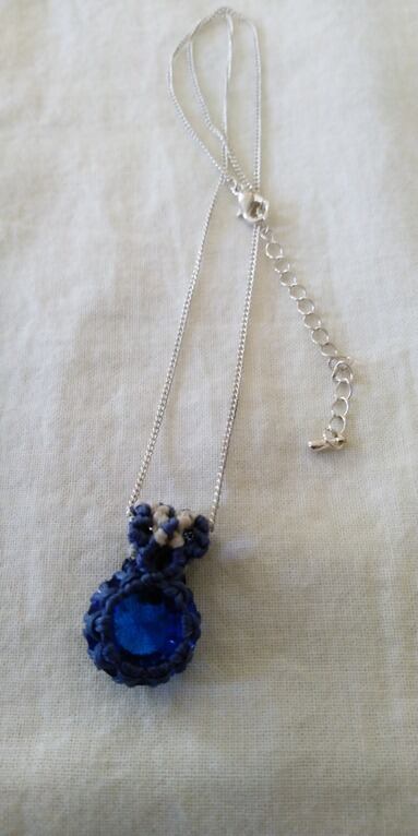 インドネシア産アンダラクリスタルのカラーバリエーションは多様にございますが、こちらは美しいブルーとなります。光の質によりルミネッセントブルーに輝いて見えるのです。小さなラウンドカットのルースをマクラメ編みで御包みいたしました。
