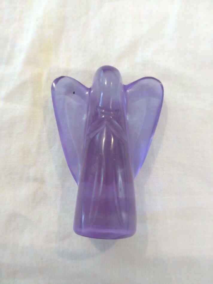 インドネシア産アンダラクリスタルのカラーバリエーションは多様にございますが、こちらは人気色のパープルピンクとなります。蛍光色の光の元ではブルー系にカラーチェンジしてみえる神秘的なアンダラクリスタルの一つとなります。今のところ小さな気泡が数か所と黒系の内包物が二つ見られます。優し気に手を合わせるエンジェルの細かなカービングには癒されてしまうのです。