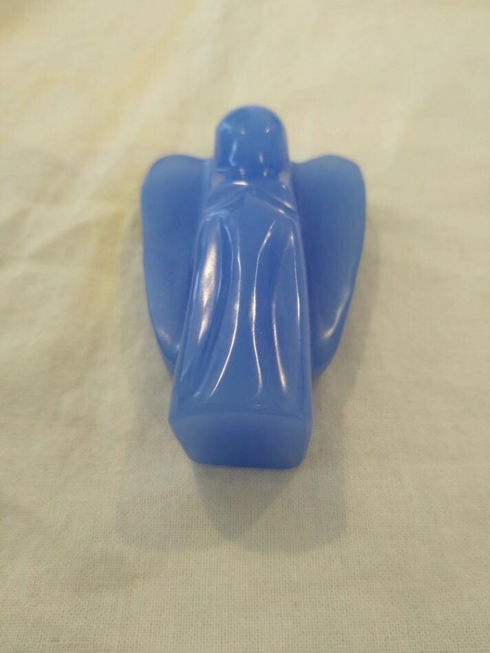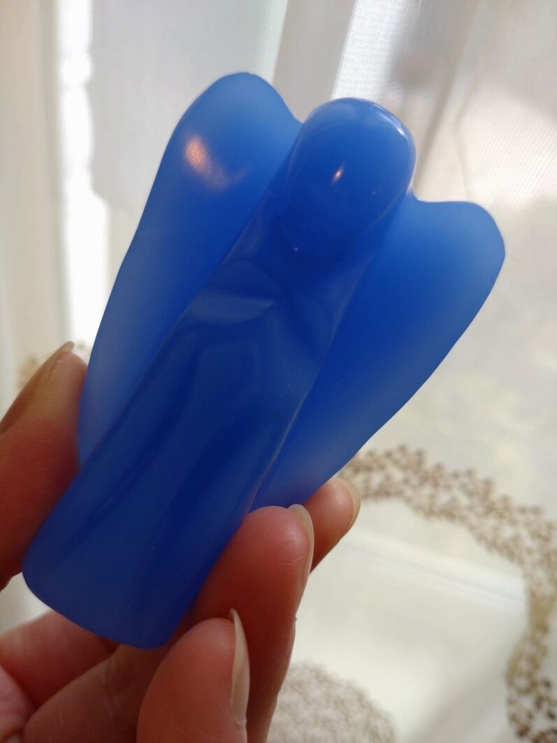 インドネシア産アンダラクリスタルのカラーバリエーションは多様にございますが、こちらは癒しのミルキーなコーンフラワーブルーとなります。今のところ気泡由来による凹みが数ヶ所見られます。優し気に手を合わせるエンジェルの細かなカービングには癒されてしまうのです。