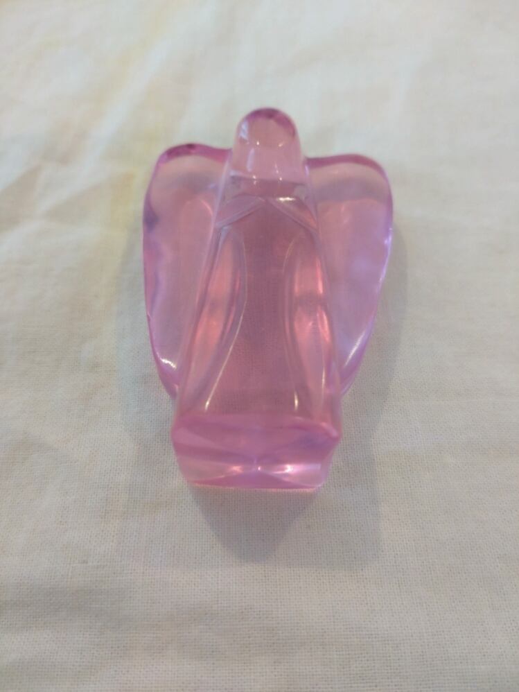 インドネシア産アンダラクリスタルのカラーバリエーションは多様にございますが、こちらは優しいピンク色となります。今のところ気泡由来による凹みや小さな気泡が数ヶ所見られます。優し気に手を合わせるエンジェルの細かなカービングには癒されてしまうのです。