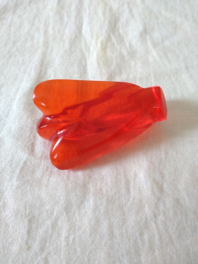 インドネシア産アンダラクリスタルのカラーバリエーションは多様にございますが、こちらは艶めき輝く色鮮やかなバーミリオン(朱色)レッドとなります。眩しすぎやしませんか?と思わず話しかけてしまうほど、自ら揺らぎなく鮮やかに発光するこちらのアンダラクリスタルの波動は、大変個性的な美しい印象を受けるのです。優し気に手を合わせるエンジェルの細かなカービングには癒されてしまうのです。