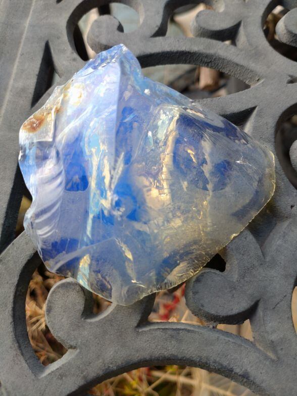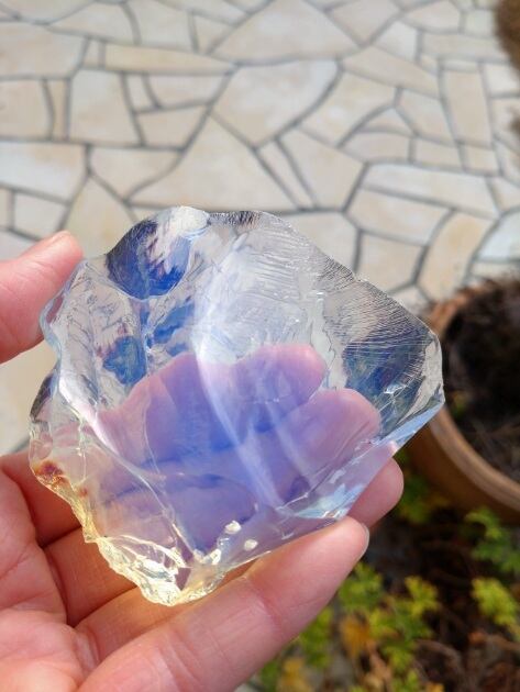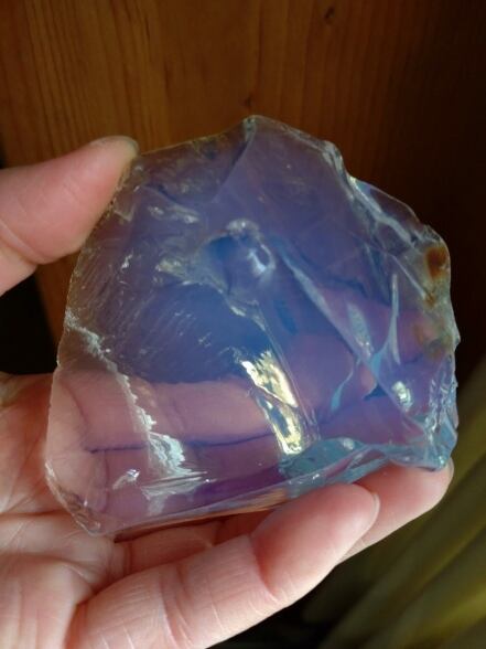 アンダラクリスタルのカラーバリエーションは多く見られますが、こちらは人気色のホワイトオパールでとなります。エンジェルオーラともいわれる神秘的な美しい色合いは、誰もが惹かれてやまないアンダラの一つではないでしょうか。光の質や当たり方により煌めき、カラーチェンジするかのような美しい色合いは視覚からも癒されるのです。手にするとクラウンチャクラがオープンとなり、天使のような優しくも心強いエネルギーが全チャクラを活性化、そして癒してくれる印象を受けるアンダラクリスタルとなります。深く刻まれたかのようなエッジや繊細なエッジは見て触れていると心身共に癒されてしまうのです。一部焼けたようなお色目の部分には銀化(虹色コーティング)も見られます。