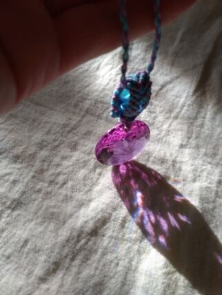 インドネシア産 アンダラクリスタル 多角面ラウンドカット・パープルピンク(カラーチェンジ)& ライトブルービーズ三珠 マクラメ編みデザインネックレス 紐長さ約108㎝位まで調節可能 ポーチ付属