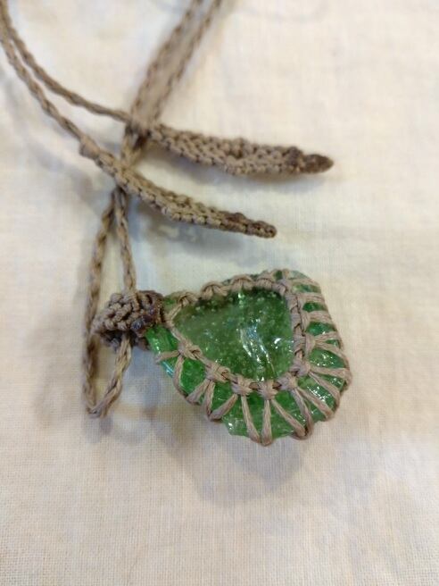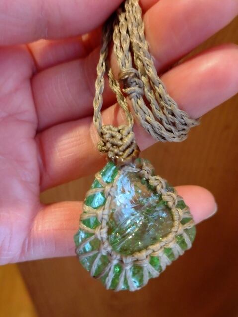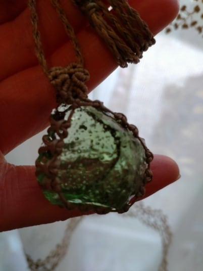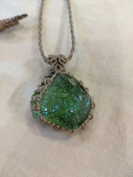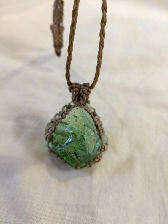 インドネシア産 アンダラクリスタル グリーンのバブル(気泡・虹入り) マクラメ編みデザインネックレス 紐長さ約86㎝位まで調節可能