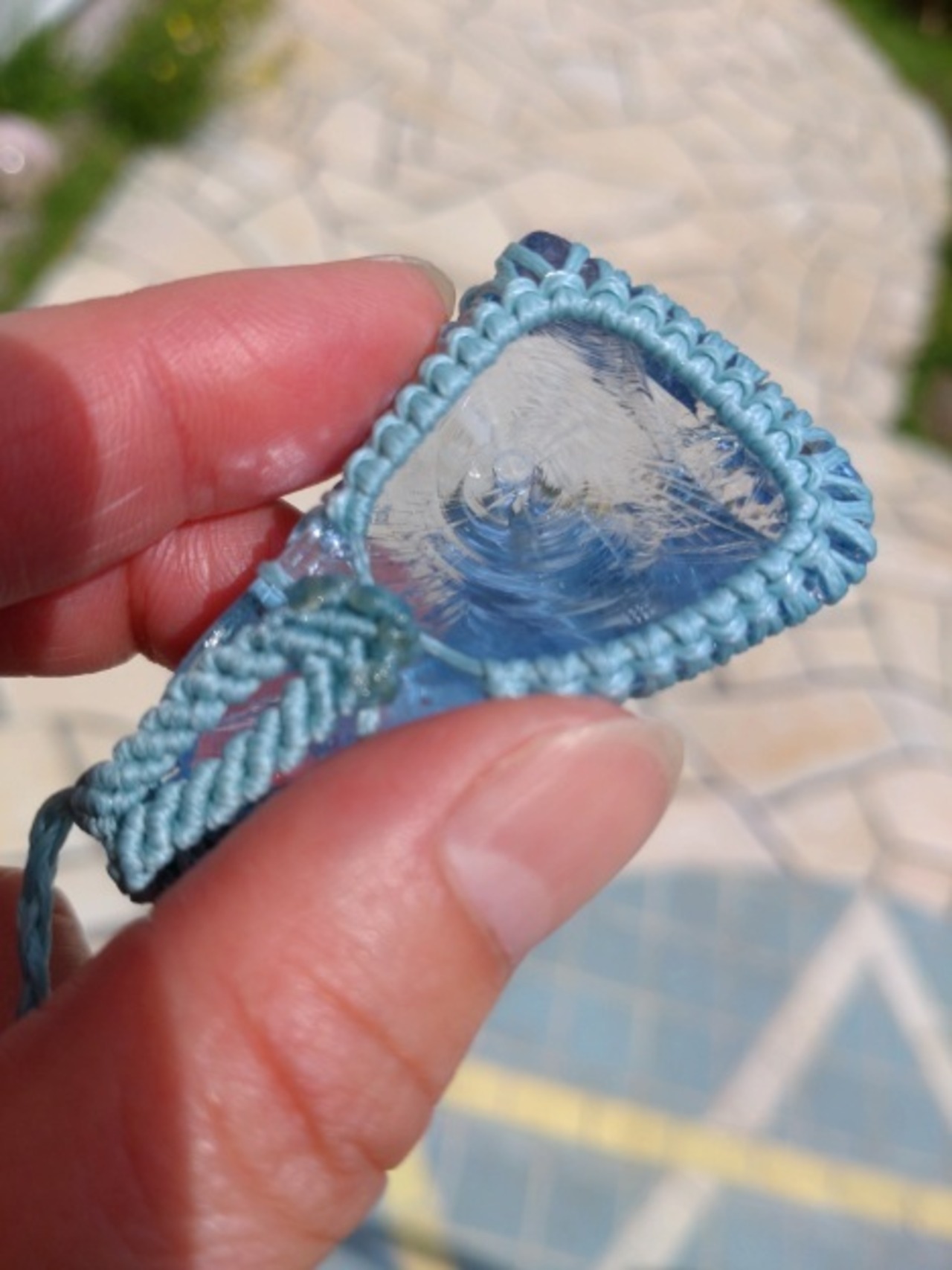アンダラクリスタルのカラーバリエーションは多く見られますが、こちらは艶めき煌めくペールブルーとなります。人それぞれ感じ方は異なるでしょうが、前面に見られる渦巻きの様なエッジや微細なシーフォーム(気泡)、裏面の繊細なエッジはいつまで神秘的で、いつまでも見て触れていたいと感じられるのです。持つ方のエンジェリックで繊細なハートに寄り添い癒し、天使界との繋がりを強固なものへと導いてくれるでしょう。