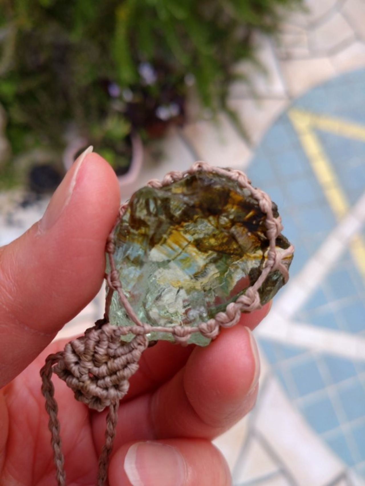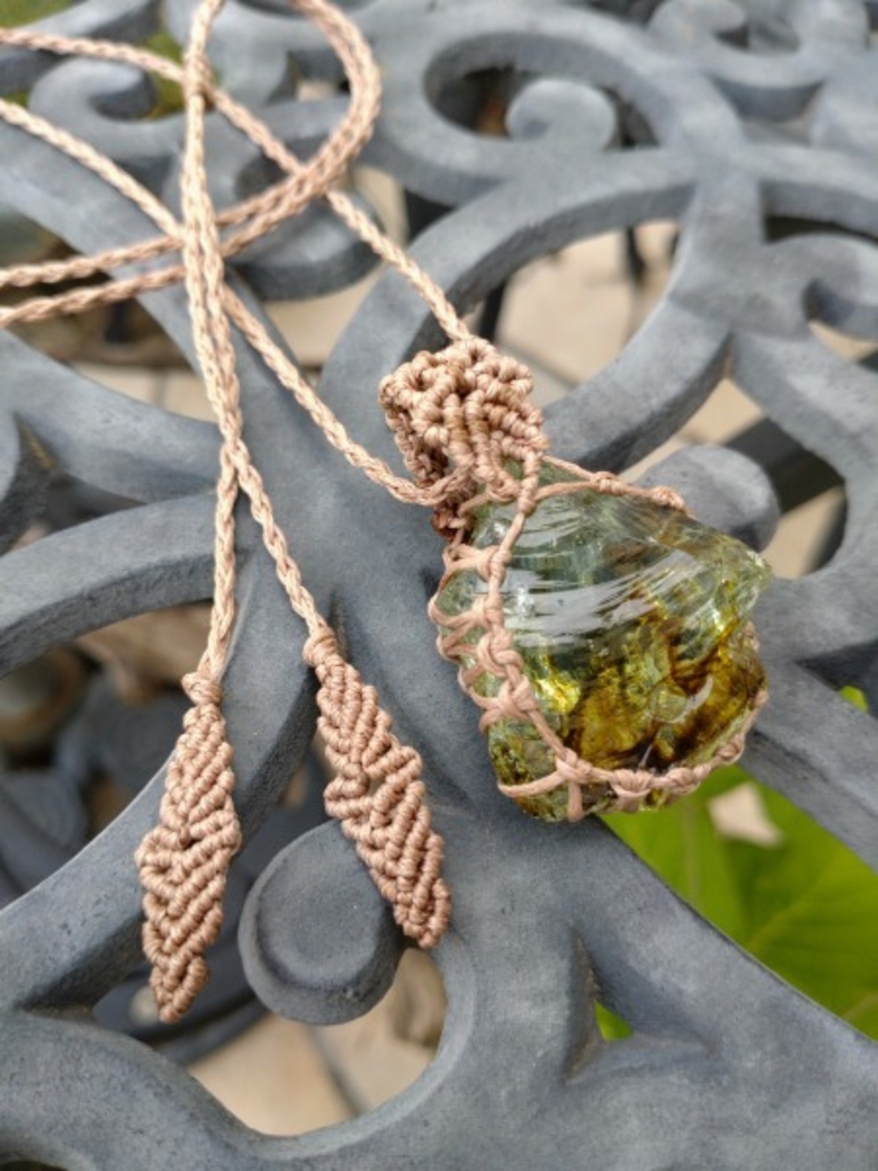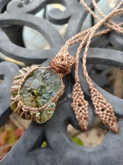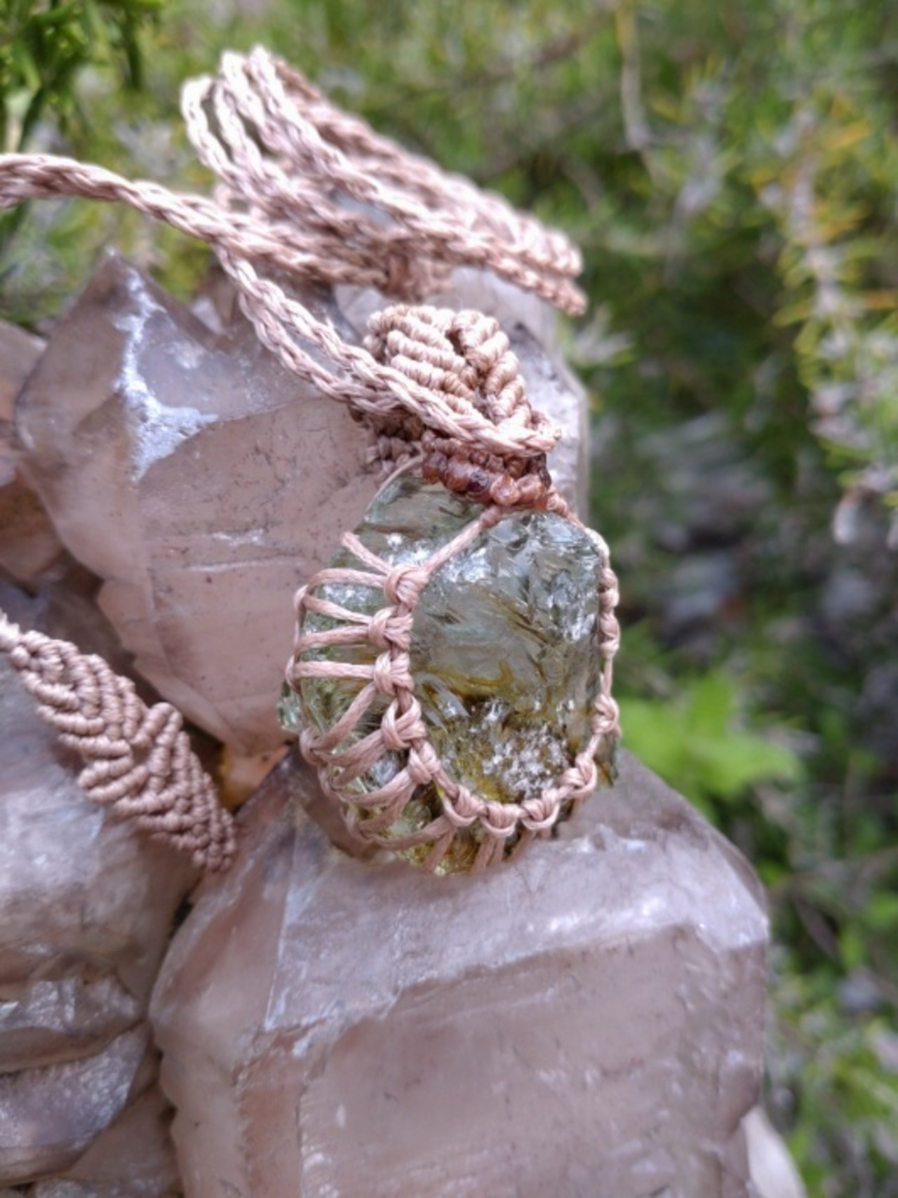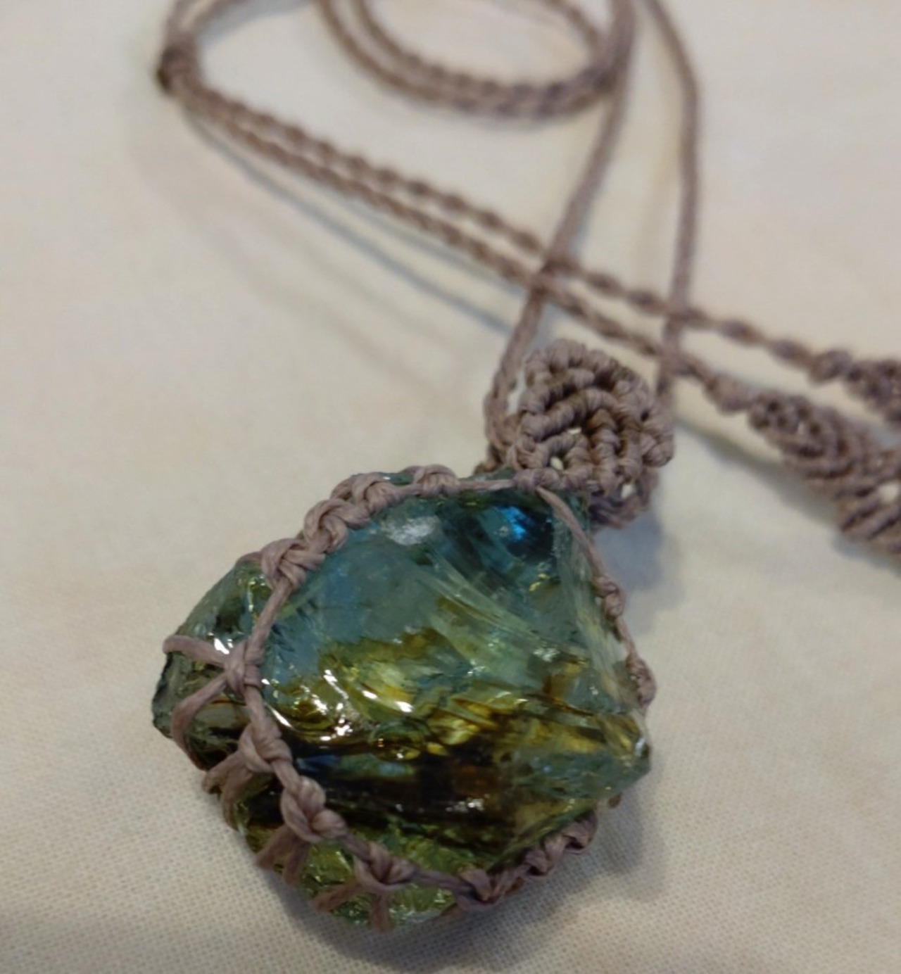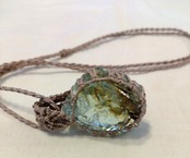 インドネシア産 アンダラクリスタル ライトグリーン&オリーブブラウン(バイカラー) マクラメ編みデザインネックレス 紐長さ約84㎝位まで調節可能 ポーチ付属