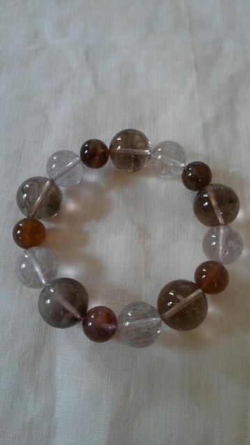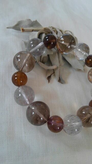クリスタル、アメシストやスモーキークォーツの三種類のクォーツの中に、カコクセナイト、レピドクロサイト、ゲーサイト、ルチル、ヘマタイト等の要素が全体的に入っている為、宇宙意識と繋がる石といわれながらもグラウンディングの力が強いものも多くみられ、とてもバランスのとれた石です。