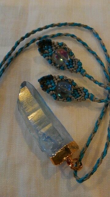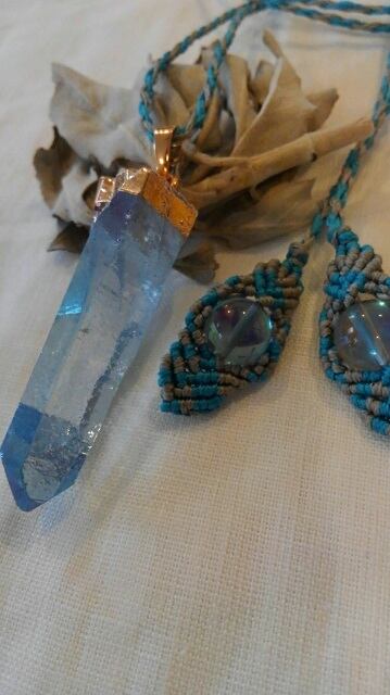 アクア(ブルー)オーラ・ナチュラル水晶ポイントペンダントトップ&ブルールナフラッシュ ☆ マクラメ編みデザインネックレス 長さ約90cm位まで調節可能