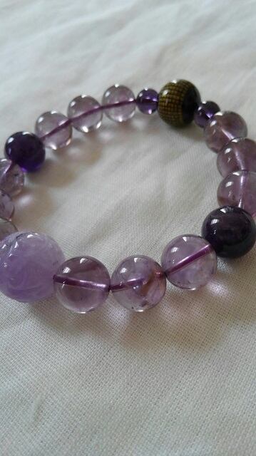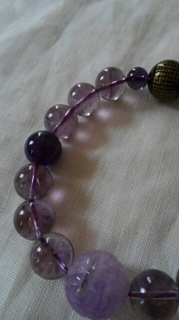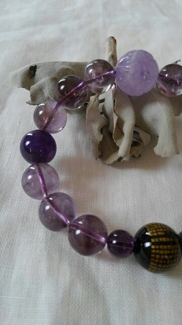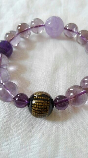 石:般若心経彫りブラックオニキス約14mm、蓮彫りアメシスト約16mm、スモーキーファントムアメシスト約11,5~12mm、アメシスト約12mm、約8mm