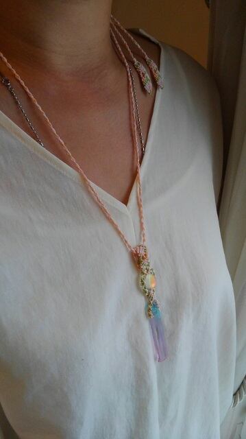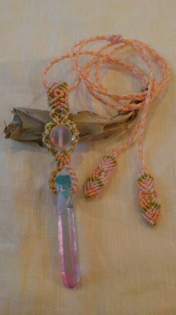 ピンク&ブルー染色天然水晶ポイント(フロスト加工)& ルナフラッシュ(フロスト加工)マクラメ編みデザインネックレス 長さ約88cm位まで調節可能
