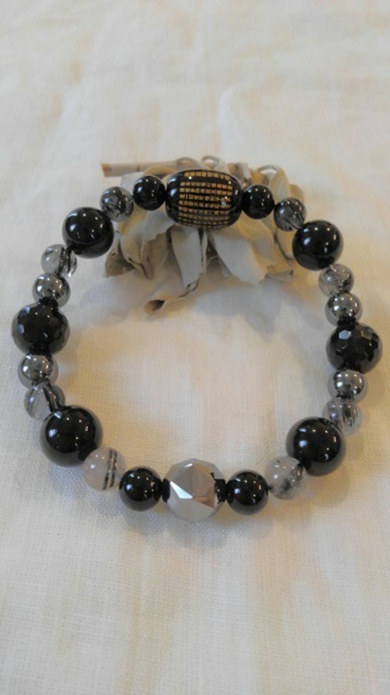 限定品 ★ 般若心経彫りブラックオニキス・テラヘルツ・モリオン(黒水晶)・ブラックトルマリン イン クォーツ・ブラックオニキス・ヘマタイト デザインブレスレット 内径約19~19,5cm