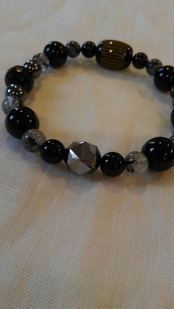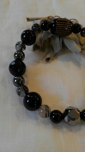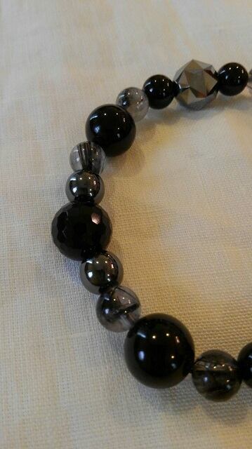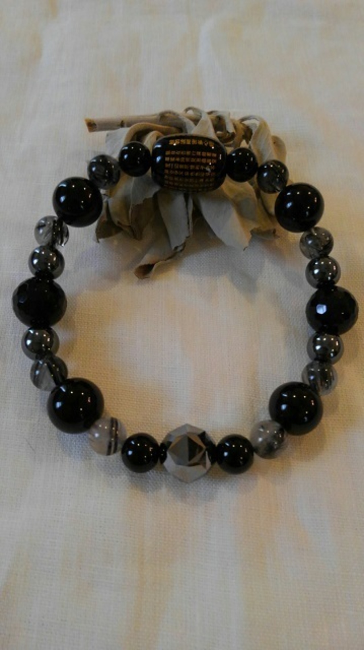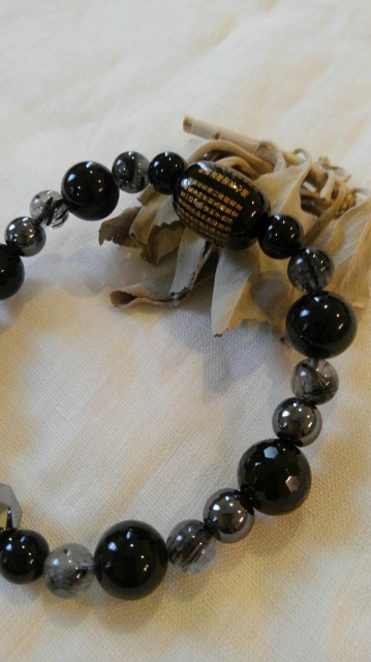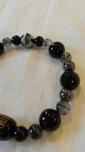 石:般若心経彫りブラックオニキス約18mm×約13mm×1玉、スターカットテラヘルツ約12mm×1玉、モリオン(黒水晶)約12mm×2玉、約8mm×4玉、ブラックトルマリン イン クォーツ約約8mm×8玉、ブラックオニキス約11,5~12mm×4玉、ヘマタイト約8mm×4玉