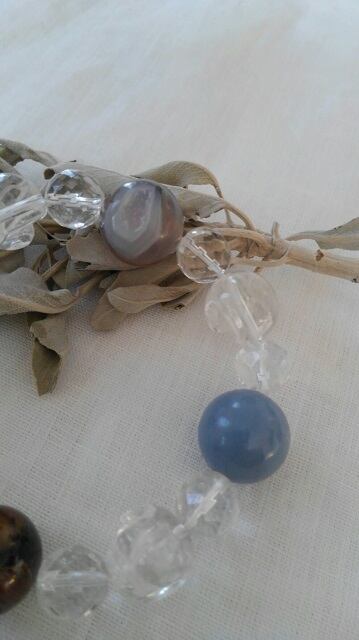 石:ドゥルージー(笑口)アゲート約16mm、アンダルサイト(キャストライト)約16mm、エンジェライト約16mm、ラブラドライト約15mm、スカル(骸骨)彫り水晶約14mm、水晶10,5mm