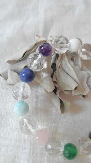 天然石はホワイトオニキスとゴールドルチルクォーツ、オレンジアゲート、ガーネット、グリーンアゲート、ローズクォーツ、アクアマリン、ラピスラズリ、アメシスト、水晶の10種、そして人口石のルナフラッシュを組ませて頂きました。