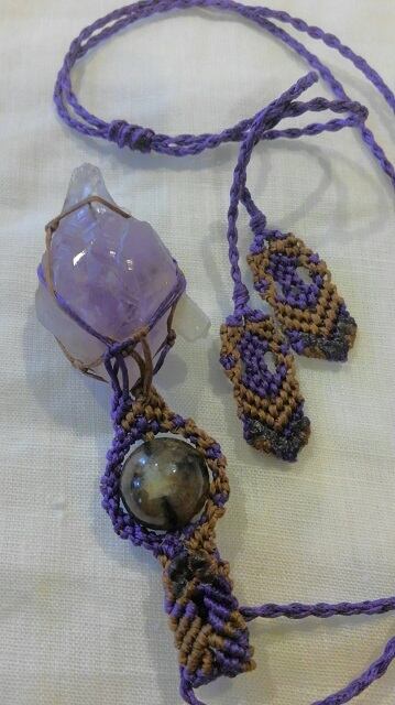 カルサイト共生アメシスト原石&アンダルサイト(キャストライト)★ マクラメ編みデザインネックレス 長さ約76cm位まで調節可能
