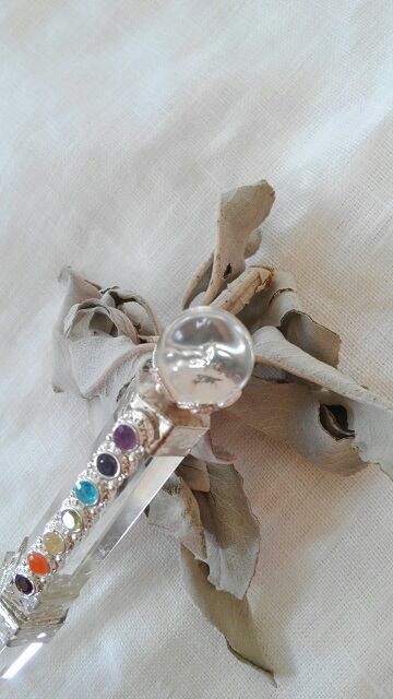 こちらはその水晶がベースのヒーリングワンドとなります。ヒーリングワンドはエネルギーを流せるように制作されております。頂点には水晶のオーブ(宝珠)が配置されており、七つの宝石(アメジスト、アイオライト、ブルートパーズ、ペリドット、シトリン、カーネリアン、ガーネット)が装飾されたデザインとなります。