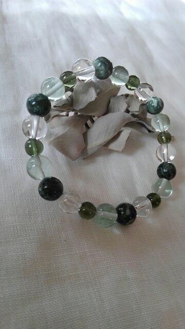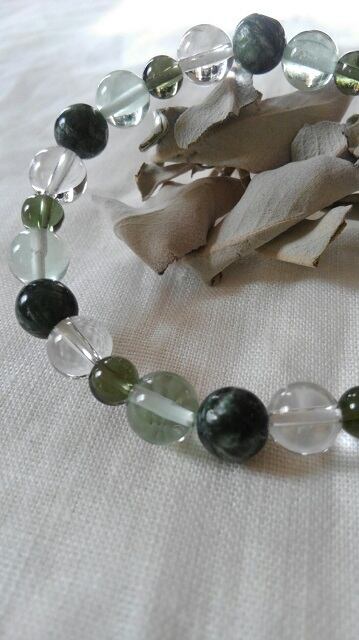 【Y様よりオーダー分】 セラフィナイト・グリーンフローライト・モルダバイト・水晶 オーダーブレスレット 内径約15~15,5cm