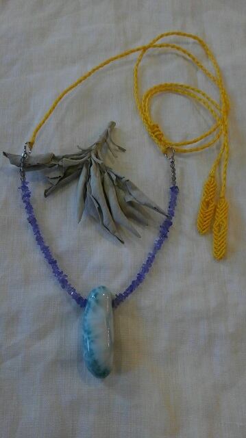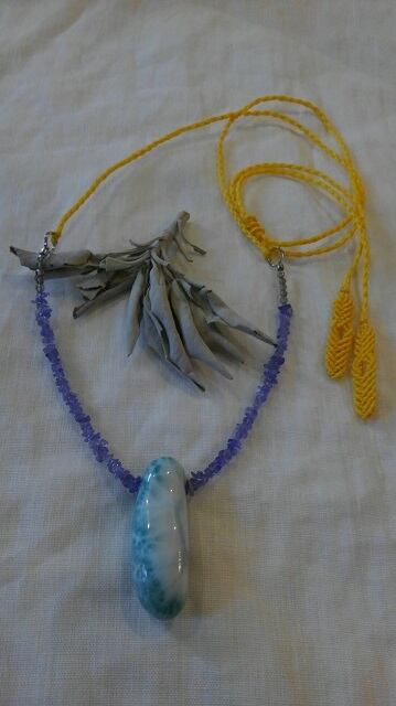ラリマー・タンザナイトさざれ石・スモーキークォーツ マクラメ編みデザインロングネックレス 長さ調節約104cm位まで可能