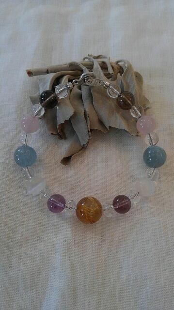 その他にローズクォーツ、スモーキークォーツ、水晶という癒しの石達を組み合わせた一点物のデザインブレスレットとなります。この石達にピンと来た方、お見逃しなく宜しくお願いいたします。